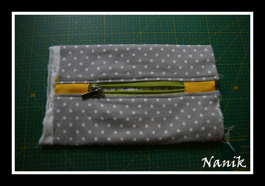 Nie zrobiłam zdjęcia całości, więc musicie mi uwierzyć, że są tu dwa kawałki materiału - zewnętrzny (szary w kropki) i podszewka (fioletowa łączka, dodatkowo biała flanela jako usztywnienie). Jaki rozmiar? To zależy, jak dużą chcecie mieć saszetkę - u mnie węższy bok prostokąta odpowiada długości zamka i to będzie długość saszetki. Dłuższy bok prostokąta - to finalny obwód saszetki.