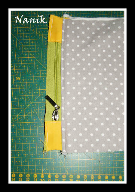 Na początek przygotowuję sobie zamek - z obydwu końców, z góry zamka, przykładam kawałki materiału (mogą wystawać na boki zamka, to i tak będzie później schowane), przeszywam je dookoła. Przed przyszyciem trzeba sobie przymierzyć, jaka długość zamka jest nam potrzebna do wygodnego korzystania - w ten sposób można dopasować długość zamka, skrócić go lub nawet trochę wydłużyć. Takie "zakończenia" trochę utrudniają wykończenie saszetki (przestębnowanie drugiej krawędzi), ale moim zdaniem estetyczniej się prezentują.