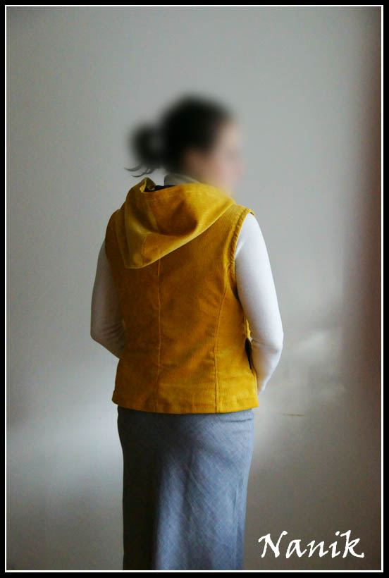Miodowy sztruks kupiłam z myślą o gorsecie (ok, to był dziwny pomysł), okazał się jednak zbyt sztywny. Potem rozważałam uszycie z niego szortów, ale i z tego zrezygnowałam. Podobał mi się ciepły kolor, kupon był jednak za mały, by uszyć choćby kurtkę. Ostatecznie stanęło na kamizelce.